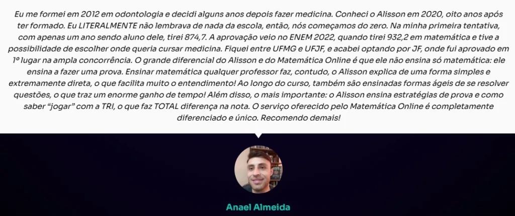 Se você der um “Google” agora, vai encontrar centenas de professores de matemática. Então, por que o curso do Alisson Marques continua crescendo e acumulando aprovados? Simples! O valor aqui não está apenas na “aula de logaritmo”, mas na arquitetura do resultado.